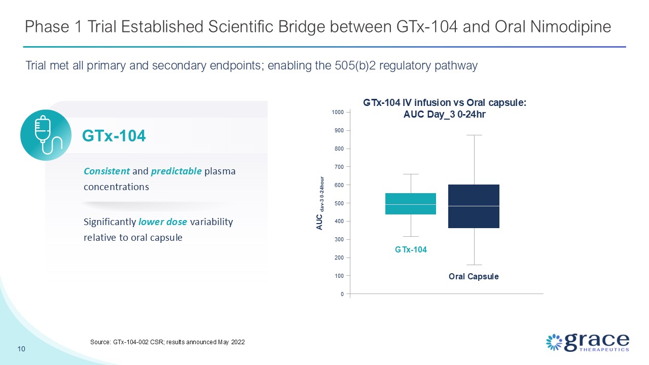 Nimodipine 10 Source: GTx-104-002 CSR; results announced May 2022 Significantly lower dose variability relative to oral capsule Consistent and predictable plasma concentrations GTx-104 IV infusion vs Oral capsule: AUC Day_3