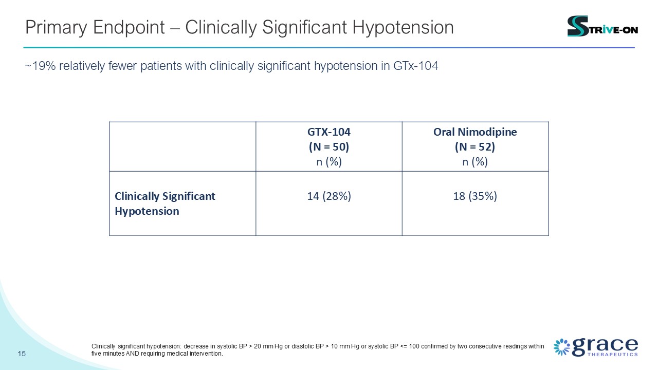 fewer patients with clinically significant hypotension in GTx-104 GTX-104 (N = 50) n (%) Oral Nimodipine (N = 52) n (%) Clinically Significant Hypotension 14 (28%) 18 (35%) Clinically significant hypotension: decrease in systolic BP