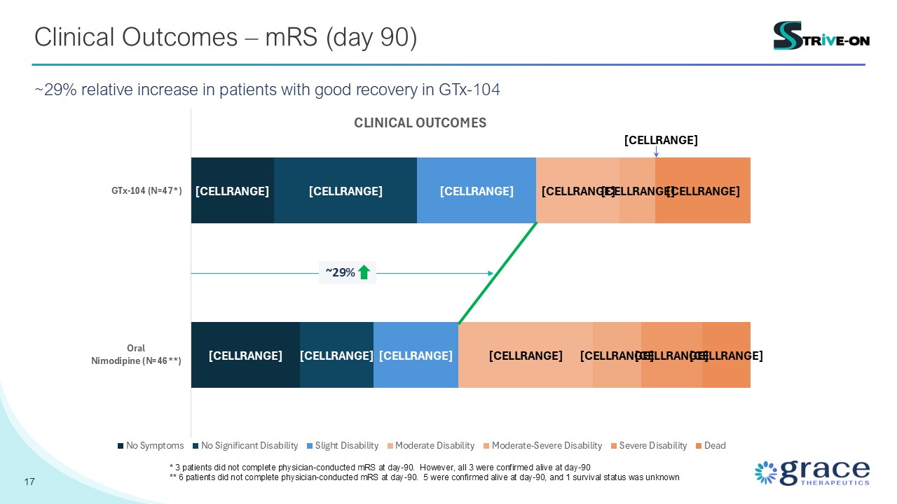 good recovery in GTx-104 ~29% * 3 patients did not complete physician-conducted mRS at day-90. However, all 3 were confirmed alive at day-90 ** 6 patients did not complete physician-conducted mRS at day-90. 5 were confirmed alive at