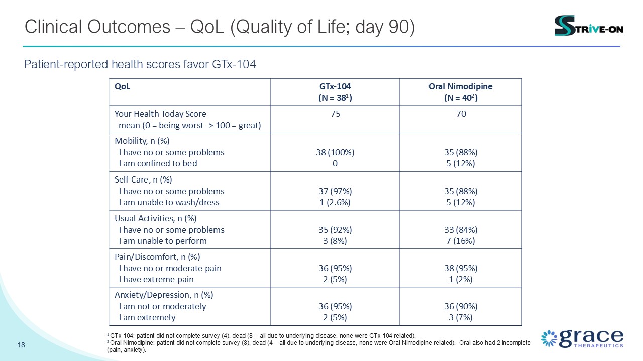 patient did not complete survey (4), dead (8 – all due to underlying disease, none were GTx-104 related). 2 Oral Nimodipine: patient did not complete survey (8), dead (4 – all due to underlying disease, none were Oral Nimodipine related).