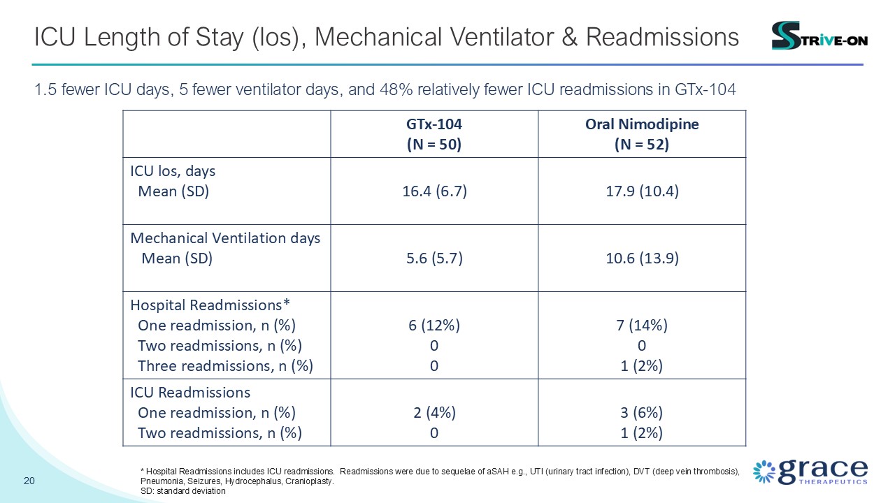 fewer ICU days, 5 fewer ventilator days, and 48% relatively fewer ICU readmissions in GTx-104 GTx-104 (N = 50) Oral Nimodipine (N = 52) ICU los, days Mean (SD) 16.4 (6.7) 17.9 (10.4) Mechanical Ventilation days Mean (SD) 5.6