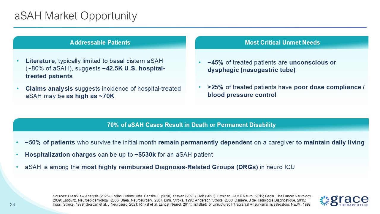 can be up to ~$530k for an aSAH patient aSAH is among the most highly reimbursed Diagnosis-Related Groups (DRGs) in neuro ICU 70% of aSAH Cases Result in Death or Permanent Disability Most Critical Unmet Needs Sources: ClearView Analysis