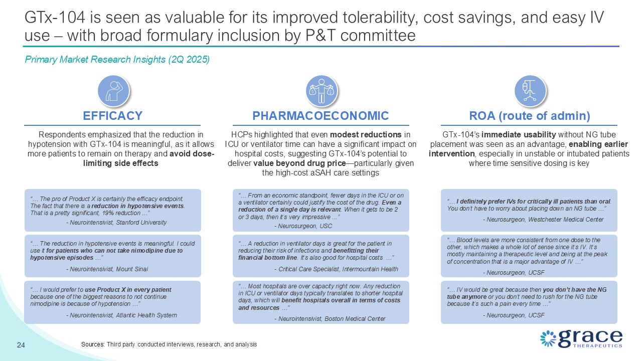 impact on hospital costs, suggesting GTx-104’s potential to deliver value beyond drug price—particularly given the high-cost aSAH care settings GTx-104’s immediate usability without NG tube placement was seen as an advantage, enabling