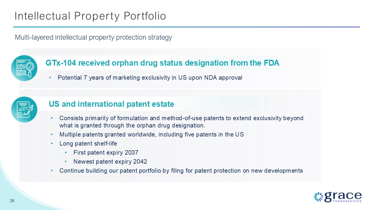 protection strategy GTx-104 received orphan drug status designation from the FDA Potential 7 years of marketing exclusivity in US upon NDA approval US and international patent estate Consists primarily of formulation and method-of-use