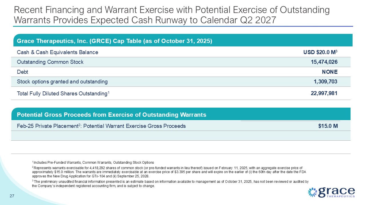 Warrants Provides Expected Cash Runway to Calendar Q2 2027 Grace Therapeutics, Inc. (GRCE) Cap Table (as of October 31, 2025) Cash & Cash Equivalents Balance USD $20.0 M3 Outstanding Common Stock 15,474,026 Debt NONE Stock