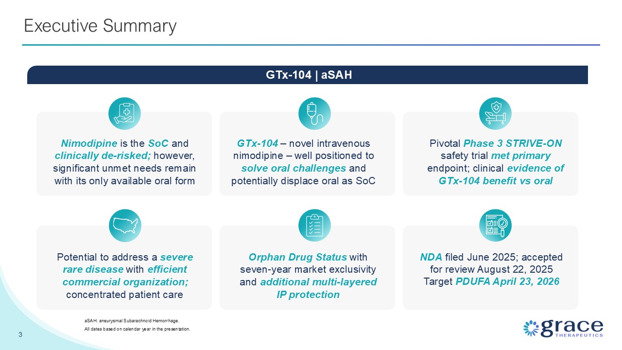 evidence of GTx-104 benefit vs oral 3 Executive Summary aSAH: aneurysmal Subarachnoid Hemorrhage. All dates based on calendar year in the presentation. GTx-104 | aSAH Potential to address a severe rare disease with efficient commercial