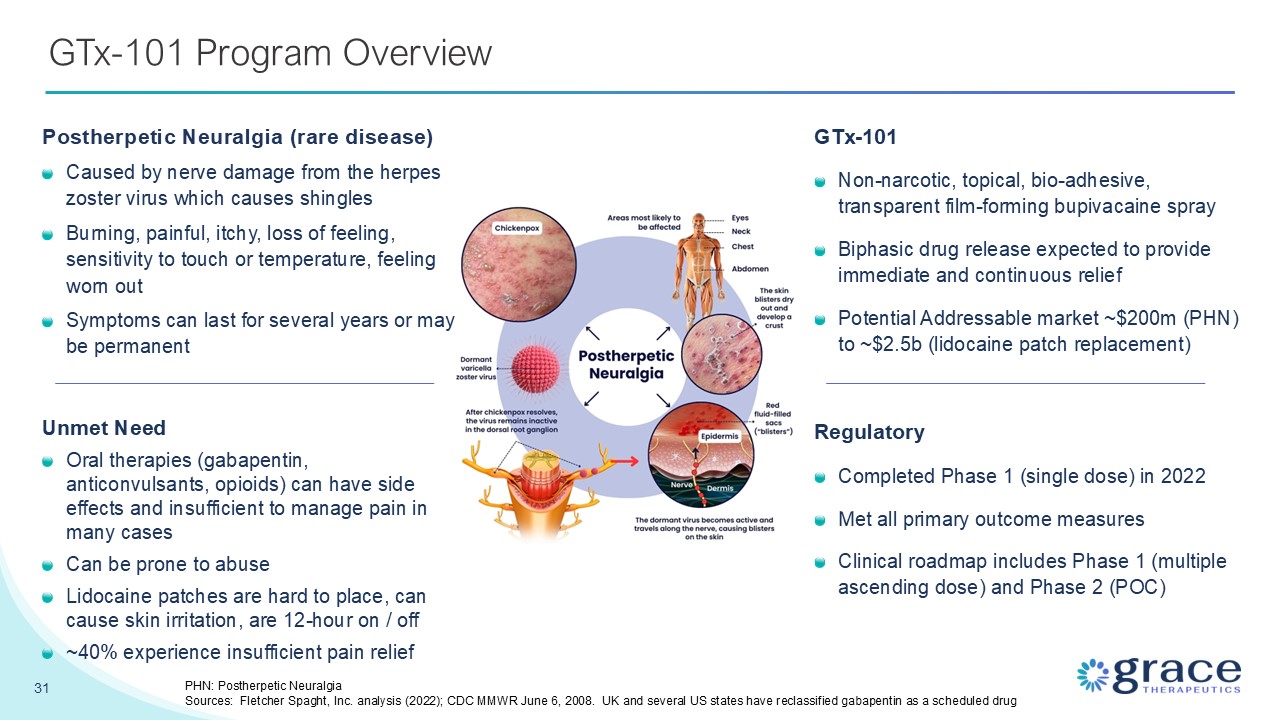 31 GTx-101 Program Overview GTx-101 Non-narcotic, topical, bio-adhesive,