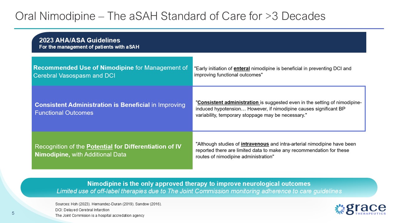 challenges and potentially displace oral as SoC Nimodipine is the SoC and clinically de-risked; however, significant unmet needs remain with its only available oral form Pivotal Phase 3 STRIVE-ON safety trial met primary endpoint; clinical