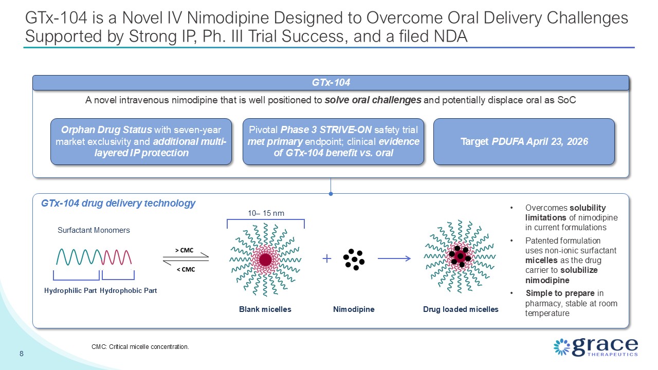 primary endpoint; clinical evidence of GTx-104 benefit vs. oral Target PDUFA April 23, 2026 GTx-104 Overcomes solubility limitations of nimodipine in current formulations Patented formulation uses non-ionic surfactant micelles as the
